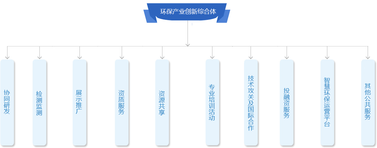 中电环保发挥行业龙头作用,联合“政产学研金才”综合资源,打造“环保产业创新综合体”,包括:“二区、三联盟、三中心、七功能”。